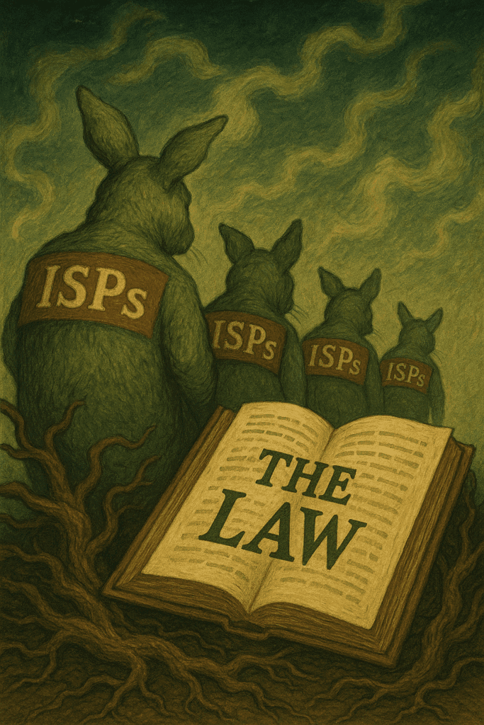 PS Feature AI image “ISPs ignoring the law, in a fantastical image” brought to you by giant dark felt bunnies turning their back on a law book growing out of roots … fascinating. I’m curious where they stole this association from.